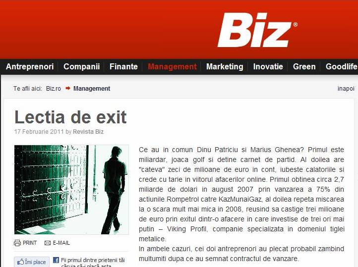 Un articol recent din revista Biz vorbeste despre cateva elemente foarte importante in ceea ce priveste un exit de succes: momentul, lacomia (sau mai precis abtinerea de la o atitudine lacoma), asumarea riscurilor si, nu in cele din urma, morala sau principiile. Gasiti articolul aici, lectura placuta!